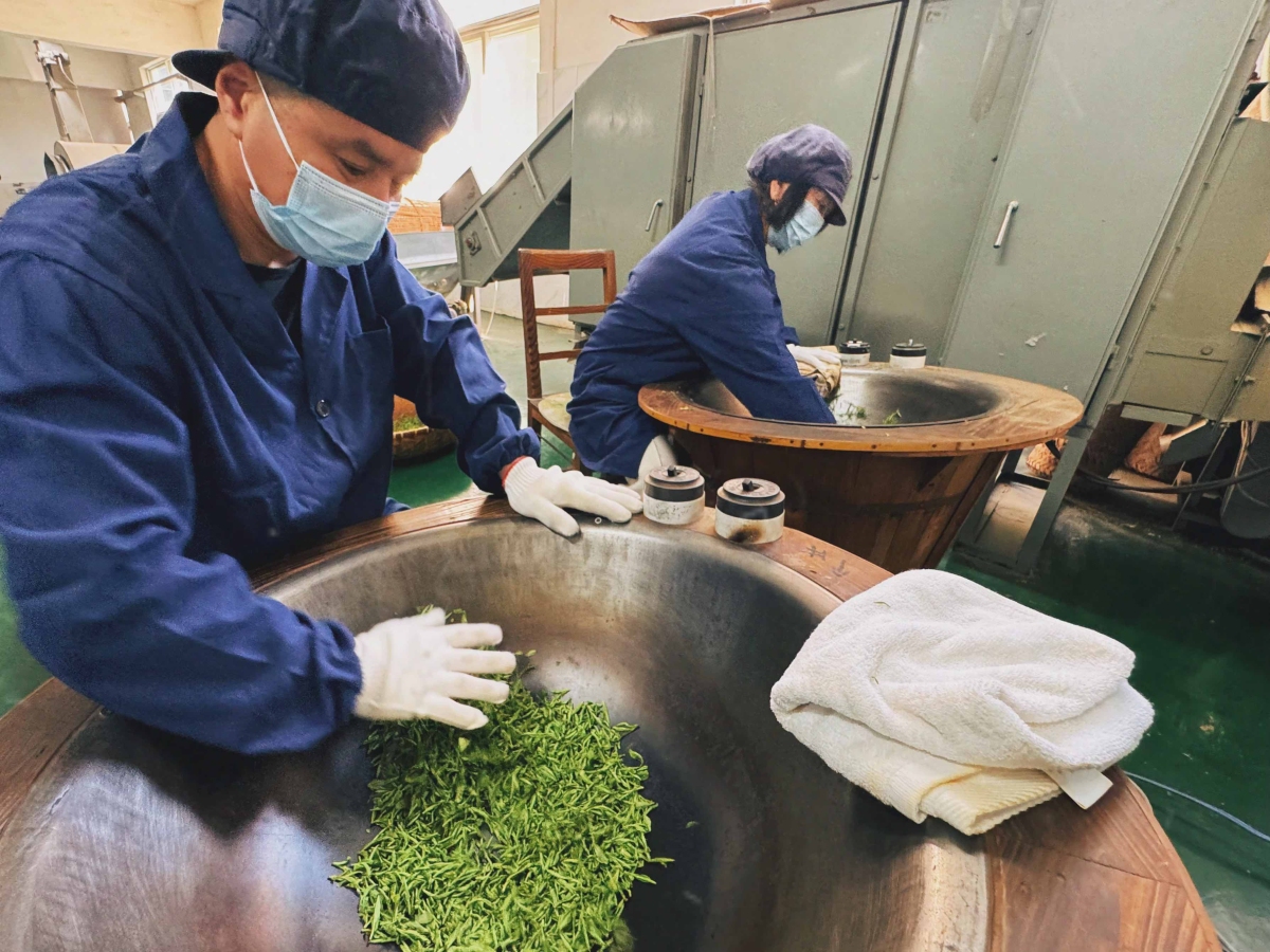 跟随人流步入茶叶加工车间,现代化生产线与手工炒茶区对比鲜明。全自动揉捻机匀速转动,而一旁的铁锅前,老师傅正以“小锅杀青”技艺翻炒茶叶,茶香扑鼻。