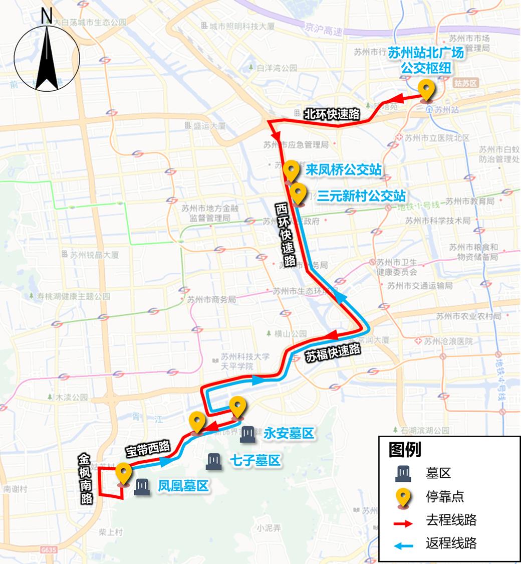 去程线路苏州站北广场公交枢纽、苏站路、(北环路)跨线桥、北环路、北环快速路、太湖大道快速路、中环西线、中环西线木东路刘庄路出口下、金枫南路、东山大道、环胥南路(胥口皋峰墓区、仙桥墓区、新麓墓区、清明墓区)。