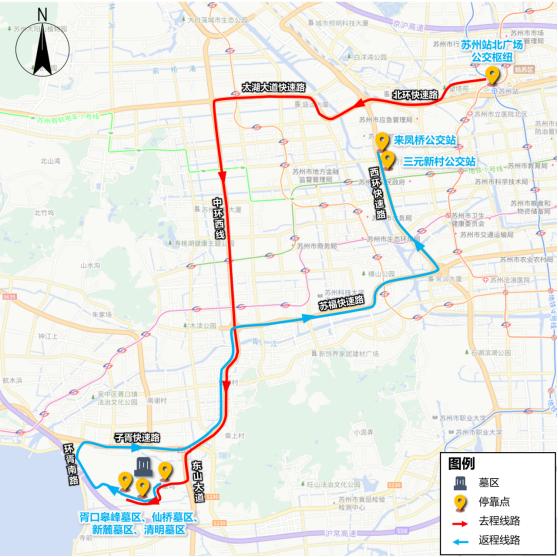 -苏州火车站至墓区专线-苏州火车站至七子墓区、凤凰墓区等大型墓区公交接驳专线,以及墓区至寒山寺景区、轨交站点等的接驳线路。运行时间为:3月22日、23日、29日、30日、4月4日、5日、6日,共计7天。