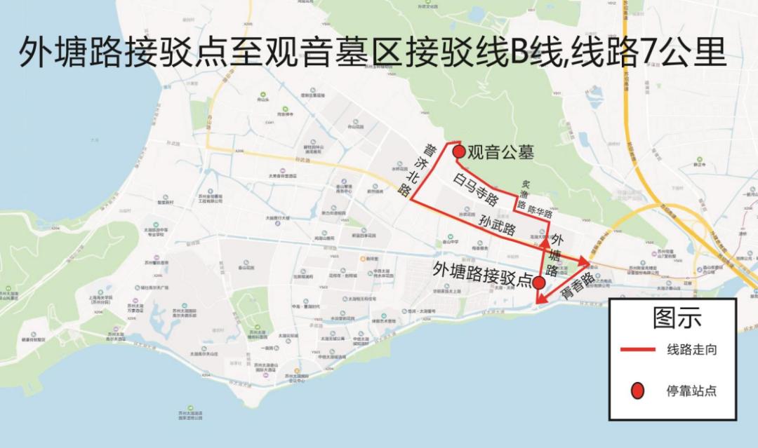 线路走向白马寺路(观音墓区)、普济北路、孙武路、胥香路、外塘路、陈华路、灸鱼路、白马寺路(观音墓区)