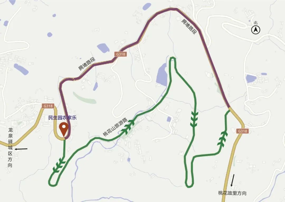 2.更换出行线路或目的地:游客可选择通过 G76成渝高速转换,从龙泉湖、石盘收费站驶出高速,经318国道后山方向前往桃花故里;也可在龙泉山后山选择合适地点停车赏花。