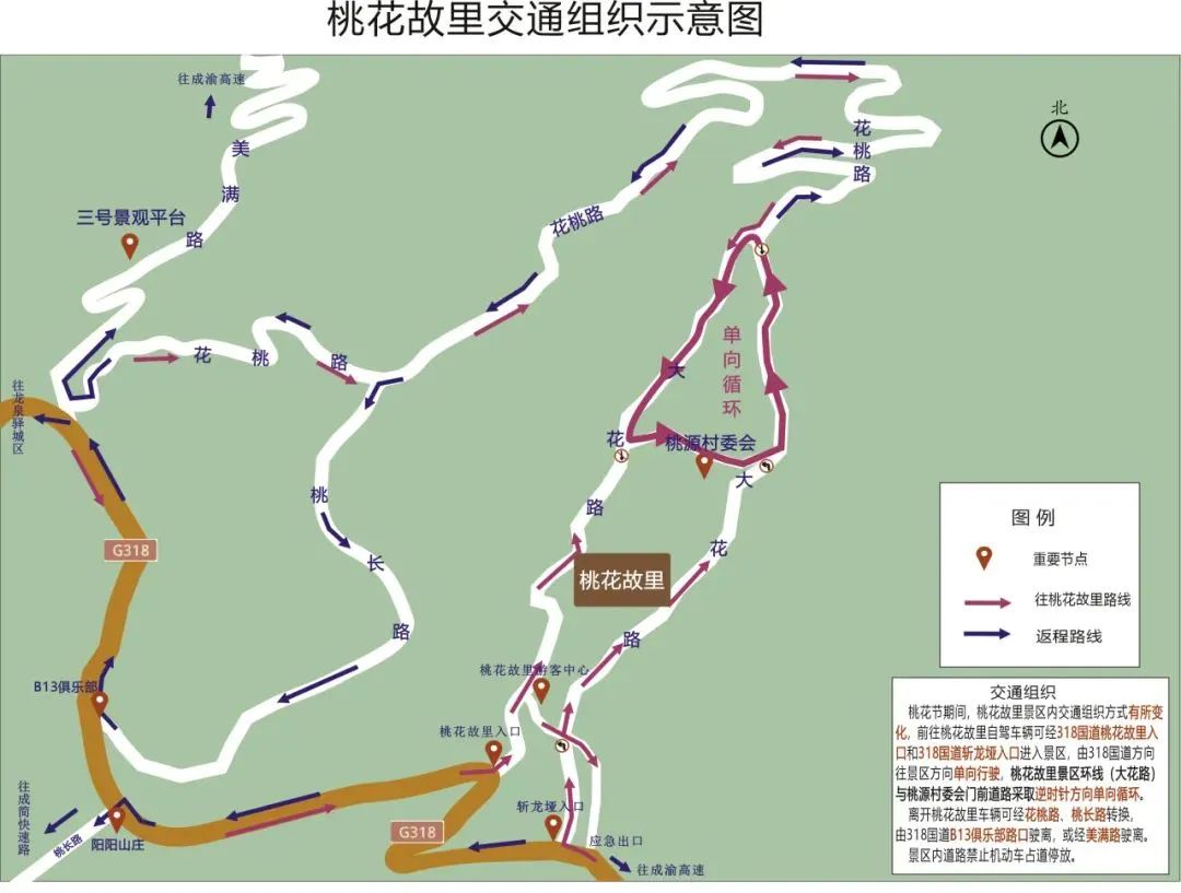 第39届桃花荟于3月15日拉开帷幕,为确保道路交通安全、畅通,桃花荟期间每周六、周日9时至20时,桃花故里景区内部道路实行单向通行。机动车可经318国道桃花故里主入口或318国道斩龙垭路口进入景区;景区内部环线道路与桃源村委会门前道路实行“逆时针单向”通行;返程车辆统一经花桃路、桃长路离开。公安机关交通管理部门还将根据道路交通流量适时调整景区内部道路交通组织。交通管控措施