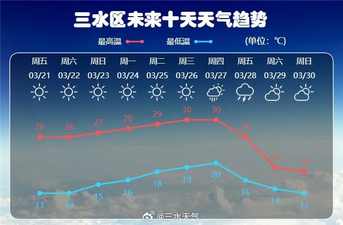 三水区气象台预计,3月21日至24日我区晴天;3月25到26日晴间多云;3月27日多云转阵雨;3月28日多云,有雷阵雨;3月29到30日多云,局部有阵雨。昼夜温差大,注意适时添减衣物;天气持续干燥,注意森林防火和居家用火用电安全。(三水区气象台2025年3月21日8时30分发布)