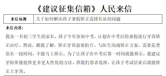 数日前,奉贤区卫生健康委收到一位初三学生家长的来信。家长表示,孩子计划中考后暑假进行牙齿矫正,但了解到矫正前拍片、沟通方案耗时久,担心无法在考试结束后就开始治疗。为此,家长建议牙防所能提供更人性化服务。