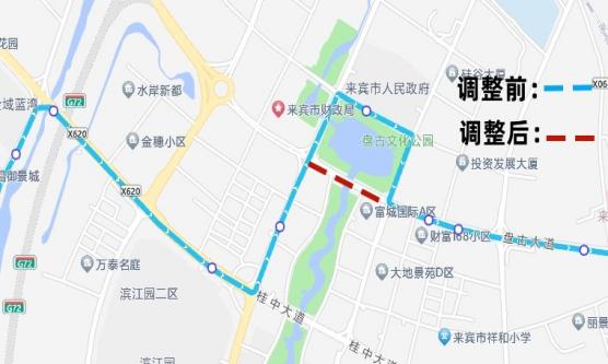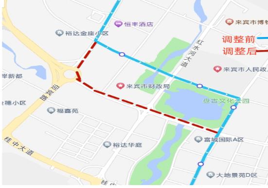 11路调整示意图5.第12路:临时调整时间11:15—16:00,迎宾路裕达金座东至政和路军分区站台路段临时调整途经桂中大道,其它站点不变;16:00后运行路线恢复正常。