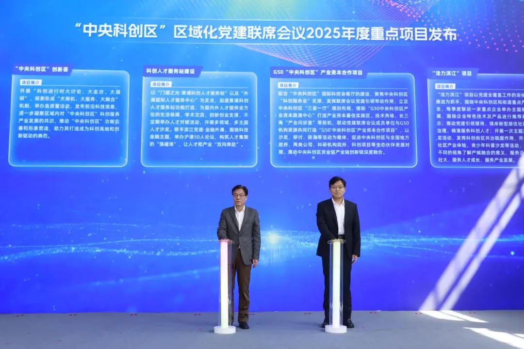 活动的最后,区委书记杲云,中建科创集团党委书记、董事长孙震,上海科学院党委副书记、院长孙真荣,上海数据集团党委书记、董事长吴建雄,国药控股党委副书记、执行董事孙京林,江南造船党委副书记、工会主席袁飞鹏,中国船舶七〇八所党委委员、副所长张拯,中国电科二十一所纪委书记王丹伟,东浩兰生集团党委副书记、工会主席倪瑾,上海交通大学医学院党委副书记赵文华共同启动“科创进行时”大讨论。2025年,“中央科创区”区域化党建联席会议将在区委组织部的指导下,围绕黄浦打造立足上海、面向世界、面向未来的“中央科创区”的战略目标,持续深化联席会议机制建设,扎实推动联席会议秘书处及六大专委会工作有序开展,以年度四大项目为工作抓手,推动工作力量在产业链上延伸、在区域范围内辐射,以党的政治优势、组织优势支持保障“中央科创区”持续布局优化、整体提势、能级跃升,为黄浦高质量发展聚势赋能。