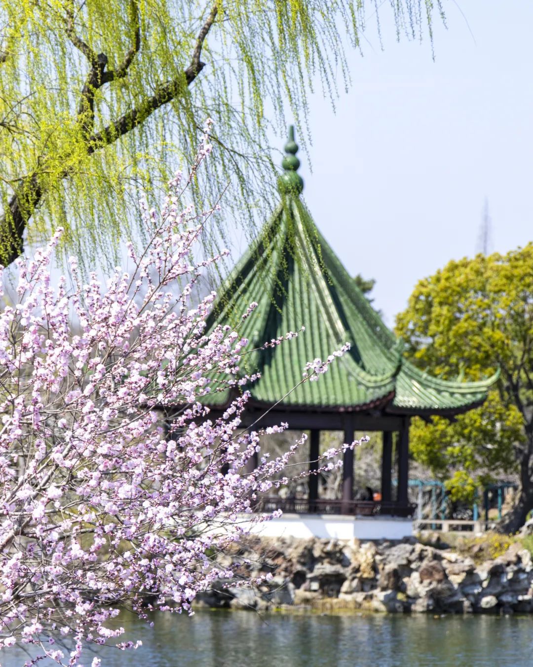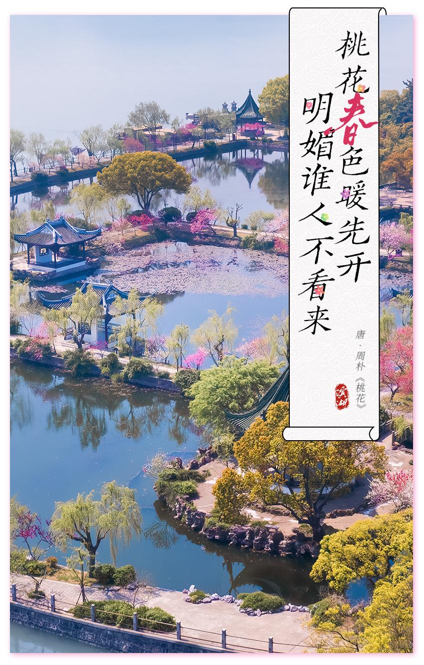 桃花夭夭,满树嫣粉,如烟如霞;柳丝轻拂,嫩绿柔条,摇曳生姿。桃红与柳绿相互映衬,交织出烂漫的春日胜景。这座江南名园,早将刹那芳华融进了唐诗中永不凋零的春天。正如诗人所言,这般明媚春色,叫人如何不倾心?