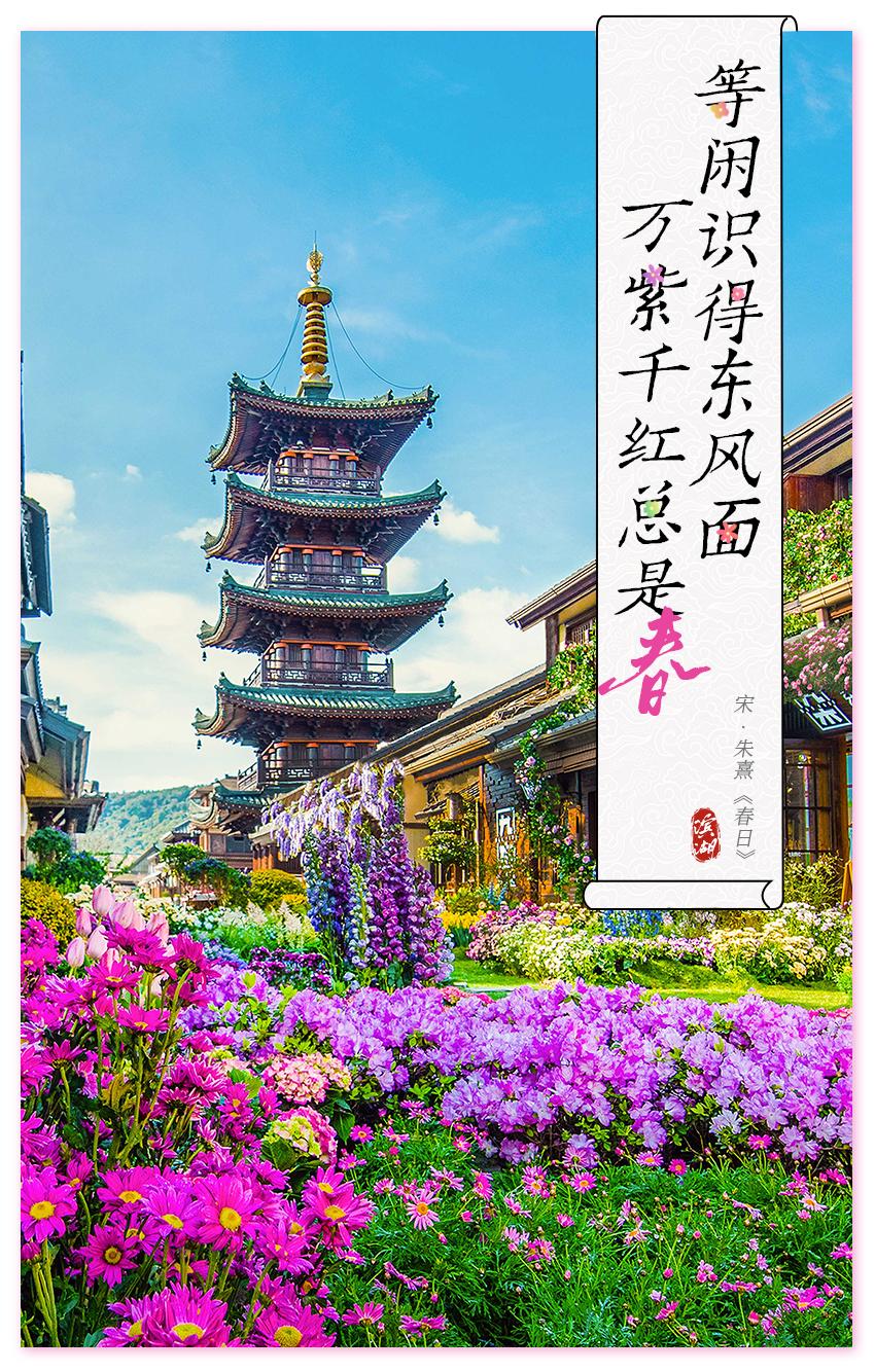 春天,“万紫千红总是春”的盛景在拈花湾触手可及。百万朵鲜花织就的香月花街,与唐风建筑构成绝美的视觉盛宴,仿佛走进了现实版“桃花源”。目之所及,郁金香、紫藤花、蔷薇……花开成海,连绵一片,好不浪漫。行走其间,娇媚的鲜花层层叠叠,一步一景,徜徉在这片醉人的花海中,让人怦然心动。