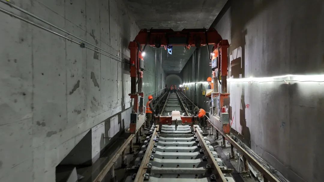 地铁“轨通”分为短轨通和长轨通两个阶段,需要将每节25米标准长的轨排沿线铺设就位,形成一条连续的轨道,再使用移动式闪光焊机将一根根钢轨无缝焊接。