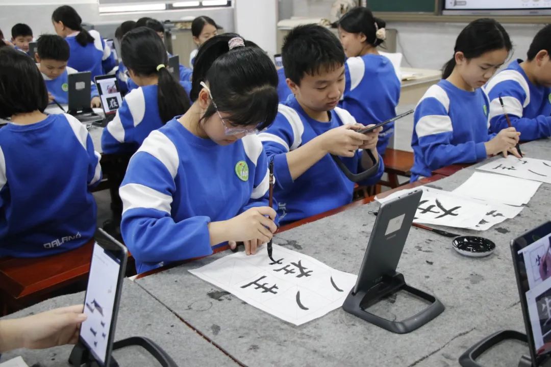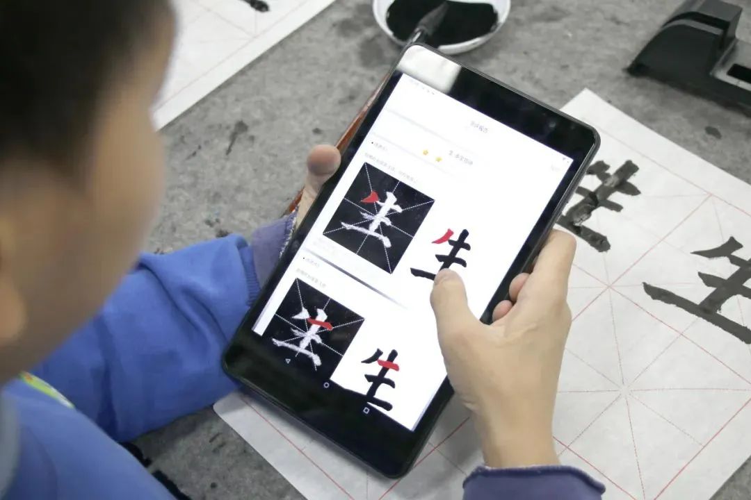 书法课上,AI化身“书法老师”,辅导学生练习书法。学生在课堂上边看、边写、边拍,而智慧平板上搭载的AI智慧书法智能评价系统,不仅能精准评价学生书法的结构优劣,还能系统分析每一笔每一划的亮点与改进空间,为学生提供个性化指导,提高课堂效率。