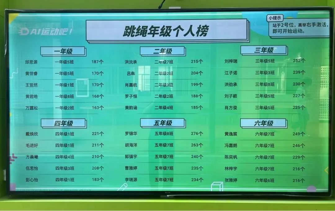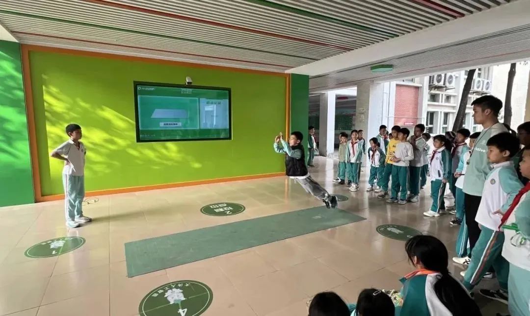在塘厦第一小学,融入跳绳、立定跳远等基础项目的AI体育系统,利用智能传感技术,在课间15分钟里的体育活动里,就能精准采集同学们的运动数据。AI也让同学们充满运动社交的热情。通过“云端擂台”功能,同学们可以在课间自由发起挑战,系统会根据成绩自动生成成长档案,使运动可视化。在课余时间,同学们都能发起挑战、参与锻炼,智能设备通过班级、年级、校级三级运动榜单的即时更新,构建起全天候的运动场景。