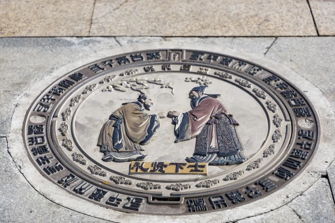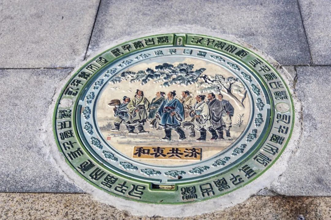 地面上,印有“德高望重”“礼贤下士”等成语典故的彩色井盖栩栩如生。