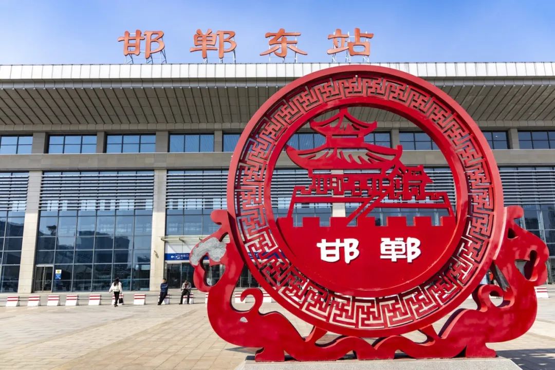 邯郸东站广场上,火红色的剪纸雕塑上刻着“邯郸”二字,中间武灵丛台的剪影雄壮巍峨。