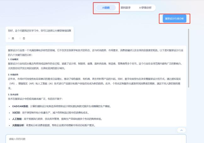 如何将学到的知识和技能应用到实践中,相信是很多同学亟待解决的问题。而平台依托DeepSeek大模型的行业数据分析能力,构建纺织服装动态知识图谱,将课程内容与时尚产业趋势、岗位技能深度绑定。构建流行趋势预测——设计软件应用——面料选择——成衣生产等板块全链路知识点,并关联国际赛事、职业资格证书等标签,实现个性化学习路径规划。同学们还能实时追踪学习进度与技能短板,获取AI推荐的行业报告、设计案例等其他学习资源,精准提升职业竞争力!