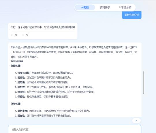 以往,同学们遇到学习上的难题,虽然可以向身边的人请教,但也总有不少需要独自面对困惑的时候。现在,学校网络课程在线学习平台全新接入DeepSeek大模型,纺织服装方向每门课程配备专属AI助手。基于每个课程资料知识库,利用DeepSeek深度搜索,分析服装设计、纺织工艺、时尚营销等专业数据,AI助手可即时解答复杂技术问题(如面料性能分析、服装版型优化、数字化印花流程等),提供行业标准解决方案与创意设计指导,助力同学们提前掌握市场动态与岗位技能,让课堂学习与产业需求无缝对接!