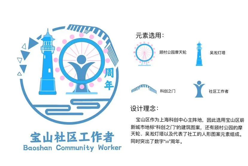 活动现场,有一个特别环节备受关注——致敬在基层坚守十年以上的社区工作者。区委社会工作部副部长为12名在岗10周年以上且今年即将退休的社区工作者代表送上了暖心礼包,感谢他们的默默付出。同时,活动还发布了“光荣在岗”十周年徽章。这枚徽章由吴淞街道和丰居民区的社区工作者臧筱蕾精心设计,融入了宝山区“科创之门”、顾村公园摩天轮、吴淞灯塔等地标元素,将“社工”化作张开双臂的人形,既代表着社区工作者对居民的守护,也寓意着宝山社会工作事业的美好未来。
