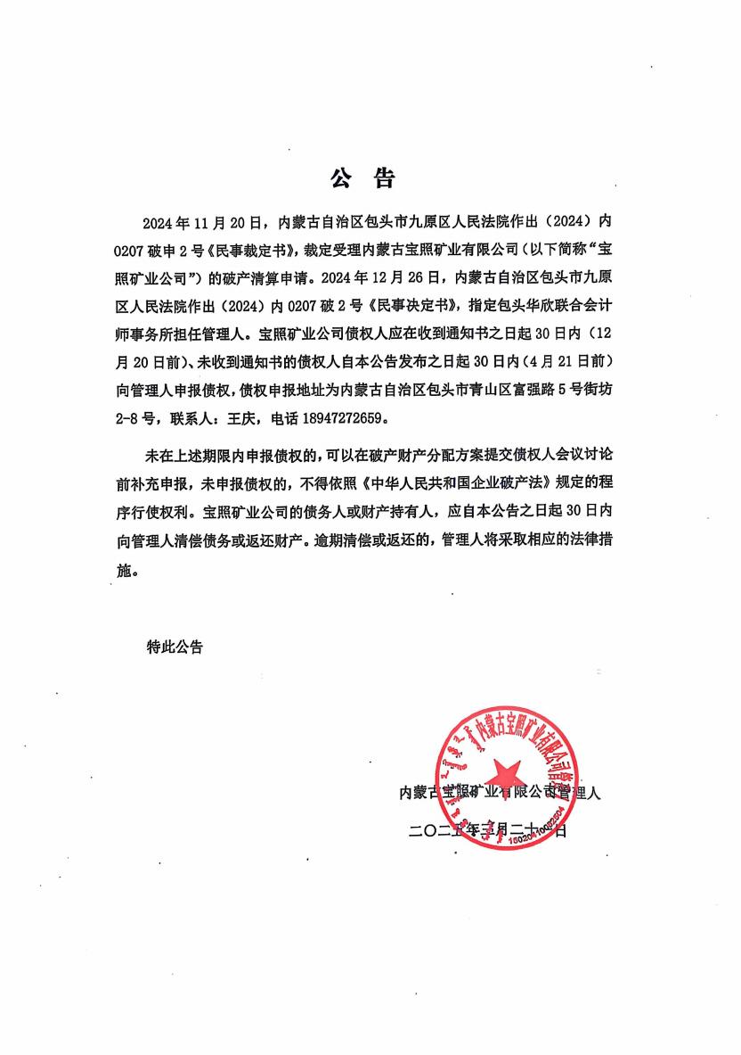 2024年11月20日,内蒙古自治区包头市九原区人民法院作出(2024)内0207破申2号《民事裁定书》,裁定受理内蒙古宝照矿业有限公司(以下简称“宝照矿业公司”)的破产清算申请。2024年12月26日,内蒙古自治区包头市九原区人民法院作出(2024)内0207破2号《民事决定书》,指定包头华欣联合会计师事务所担任管理人。宝照矿业公司债权人应在收到通知书之日起30日内(12月20日前)、未收到通知书的债权人自本公告发布之日起30日内(4月21日前)向管理人申报债权,债权申报地址为内蒙古自治区包头市青山区富强路5号街坊2-8号,联系人:王庆,电话18947272659。