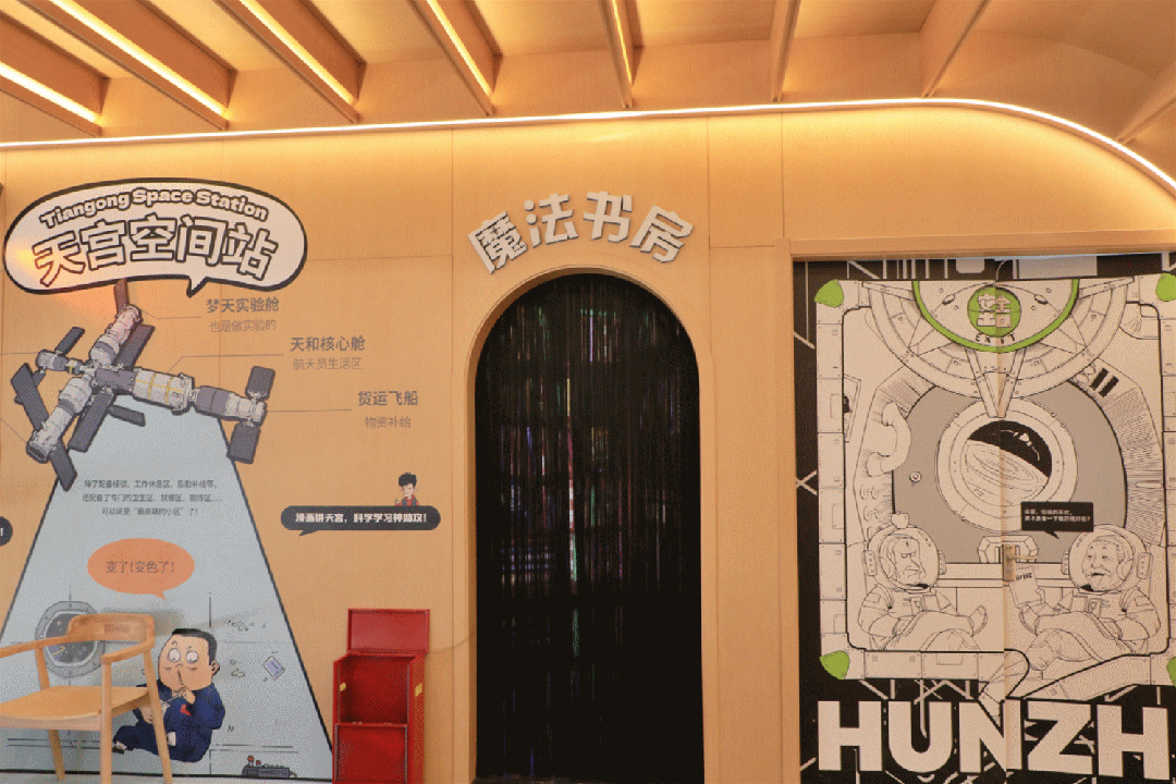 7楼是与混知书店的联名合作,从另一个角度开启科学知识的探索之旅。同样在7楼的魔法书屋将带来一个高维探索的奇幻之旅,这里藏着各式各样的科幻佳作,每一本都承载着作者天马行空的创意与想象。小朋友可以按墙上的手掌印记与之互动,各个印记有着不同的效果。