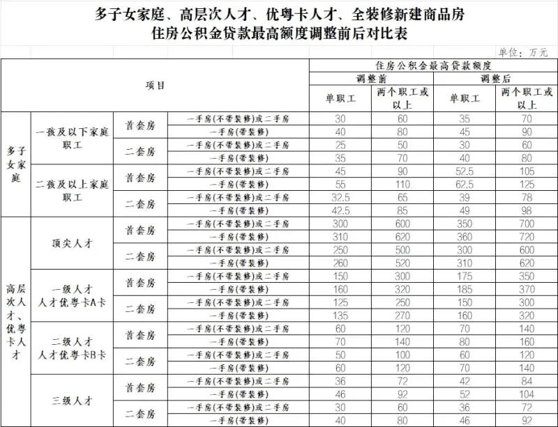 多子女家庭、高层次人才、优粤卡人才申请贷款,最高额度也会相应提高,如多子女家庭购买首套全装修新建商品房,其可申请贷款最高额度从原来的110万元提升至125万元。