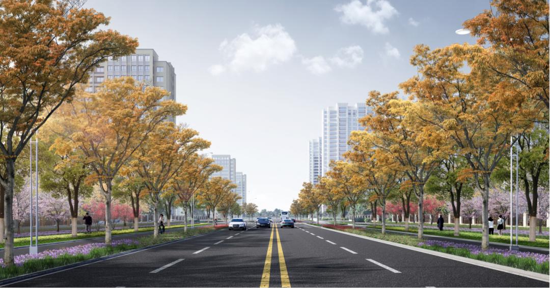 项目北起萧林路,南至震川路,全长约3165米、宽约33米。规划为城市次干路,采用双向4车道沥青路面结构。机动车道实施“白改黑”,非机动车道铺设彩色沥青面层,全线更新两侧绿化景观,打造生态型城市交通廊道。