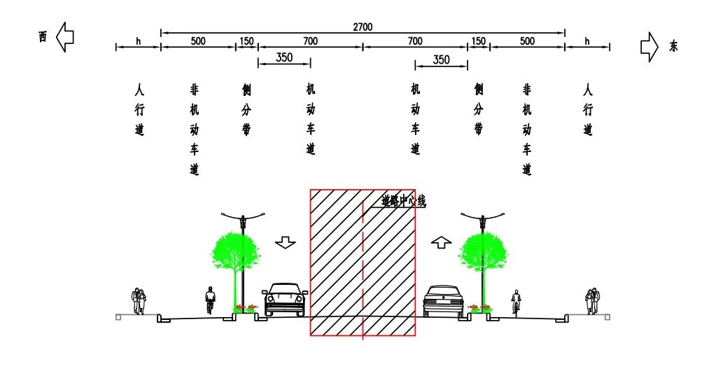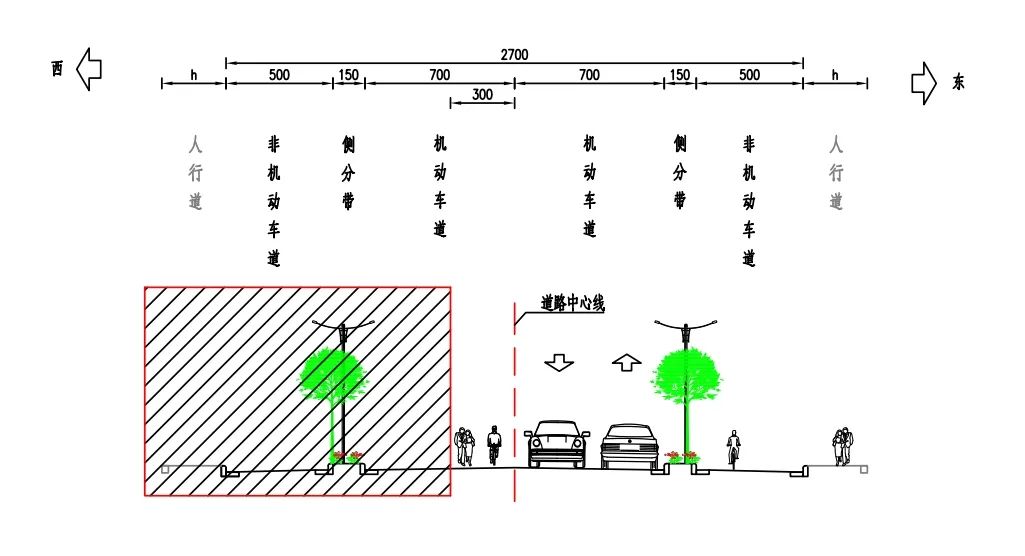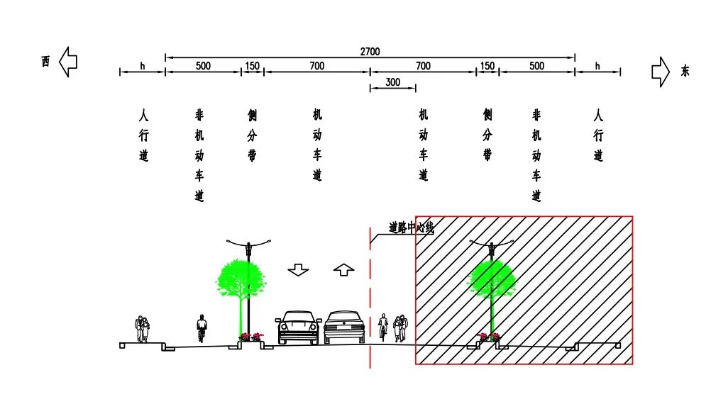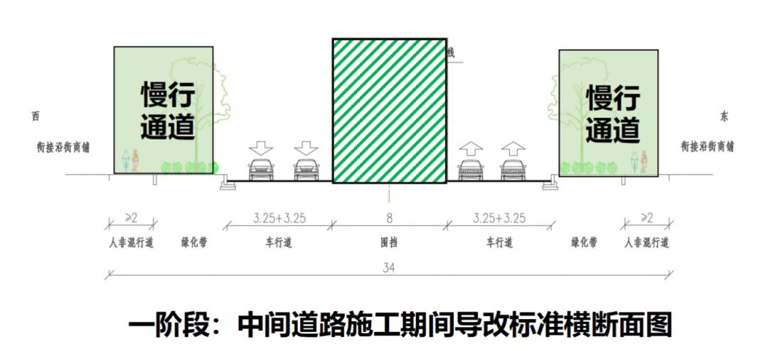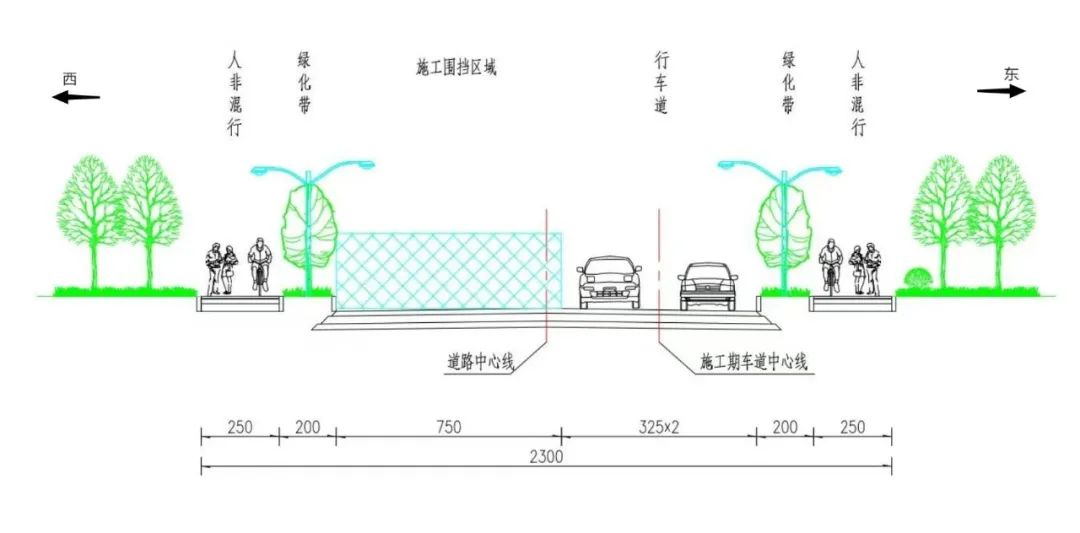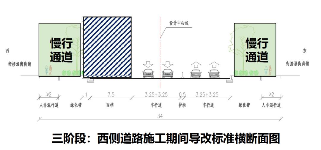 东侧机动车道封闭,西侧机动车道及两侧慢行道正常通行,断面如下: