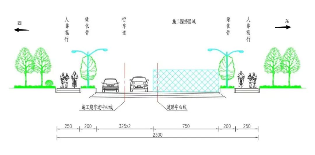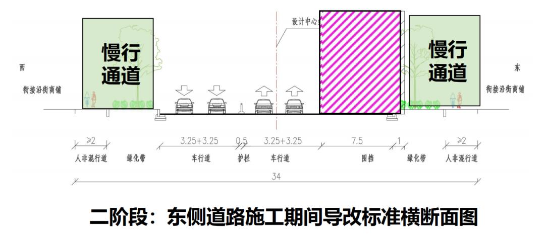 西侧机动车道封闭,东侧机动车道及两侧慢行道正常通行,断面如下: