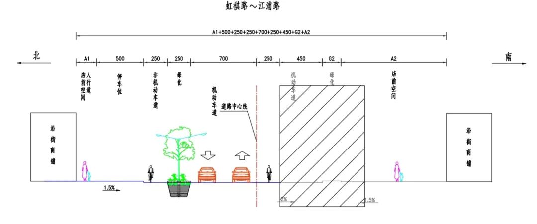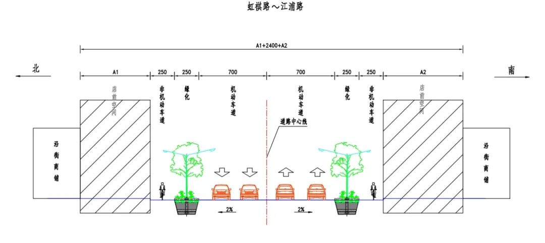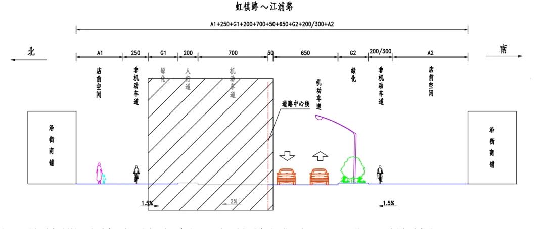项目升级改造江浦路至虹祺路段,规划为城市次干路,采用双向4车道的沥青路面结构,道路两侧构建城市慢行系统,以满足周边市民出行、休闲和健身等需求。