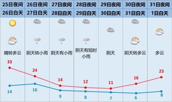 阴天转小雨,最低气温14~17℃,最高气温22~25℃;