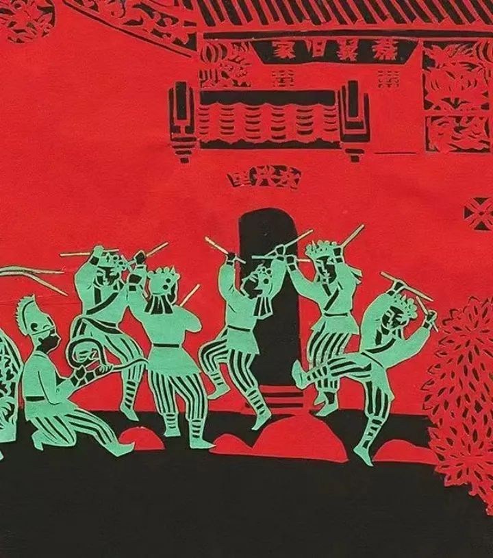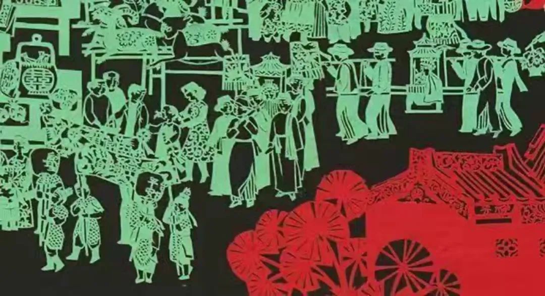 则堪称一部潮汕文化的“纸上史诗”的《汉唐遗韵·大美潮汕》剪纸长卷采用阴刻阳刻相结合的手法。长卷以“清明上河图”式的全景视角,呈现潮汕古民居、民俗活动与市井生活:从“下山虎”“四点金”的民居格局,到英歌舞、烧龙、潮剧等非遗项目;从红桃粿、工夫茶的烟火气,到嫁娶、祭祖的仪式感,各式潮汕民俗跃然纸上。上千个人物仅7厘米高,线条精细至1毫米,阴刻阳刻技法交替使用,雕镂出古建筑的飞檐翘角与市井百态。