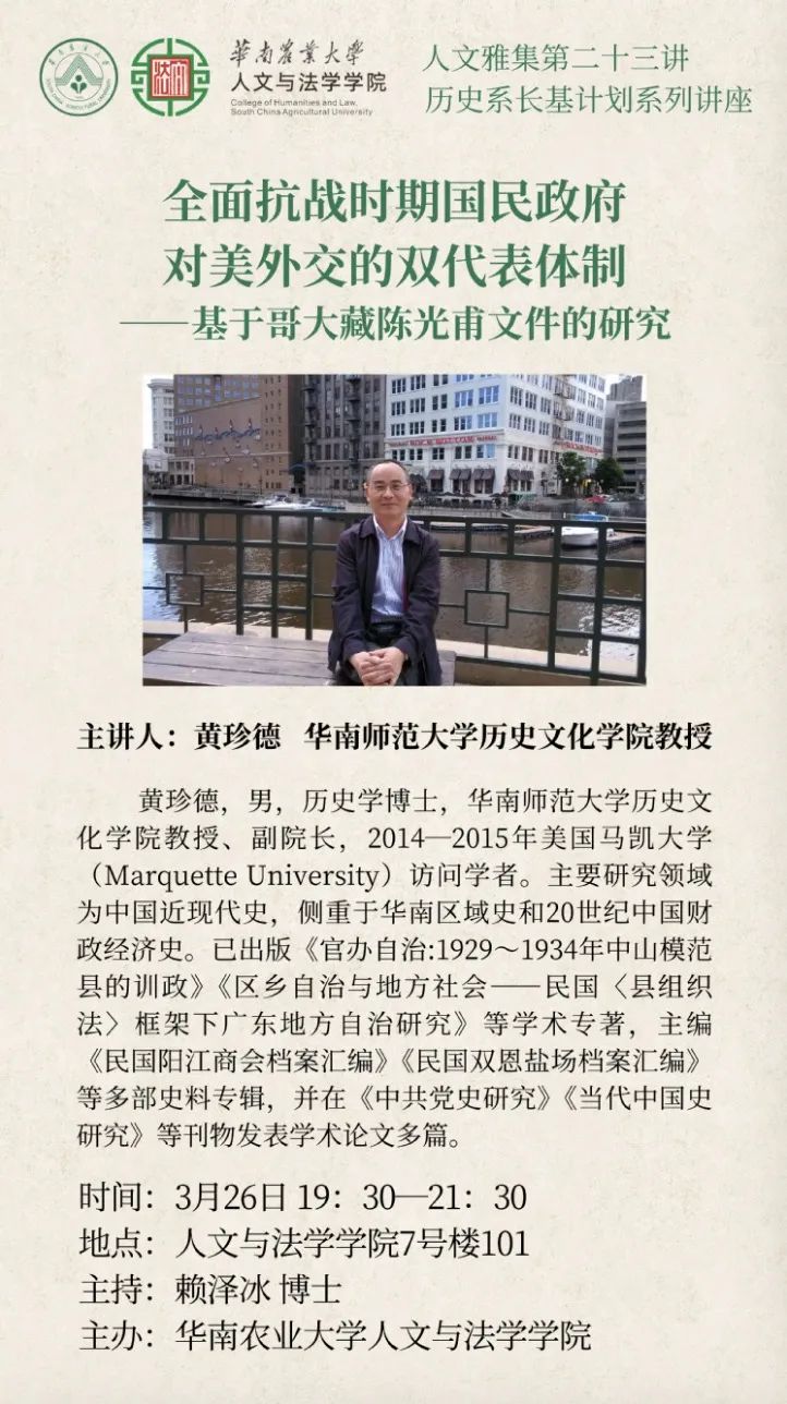 3月26日丨人文雅集第二十三讲:全面抗战时期国民政府对美外交的双代表体制——基于哥大藏陈光甫文件的研究
