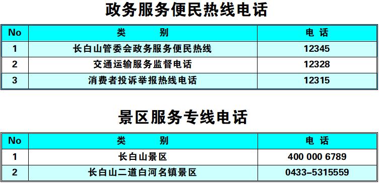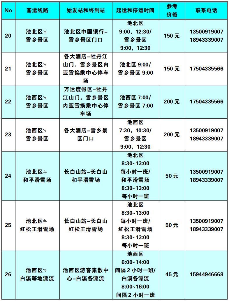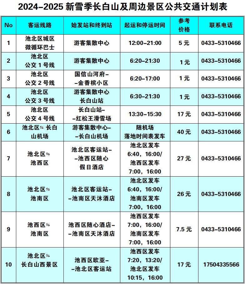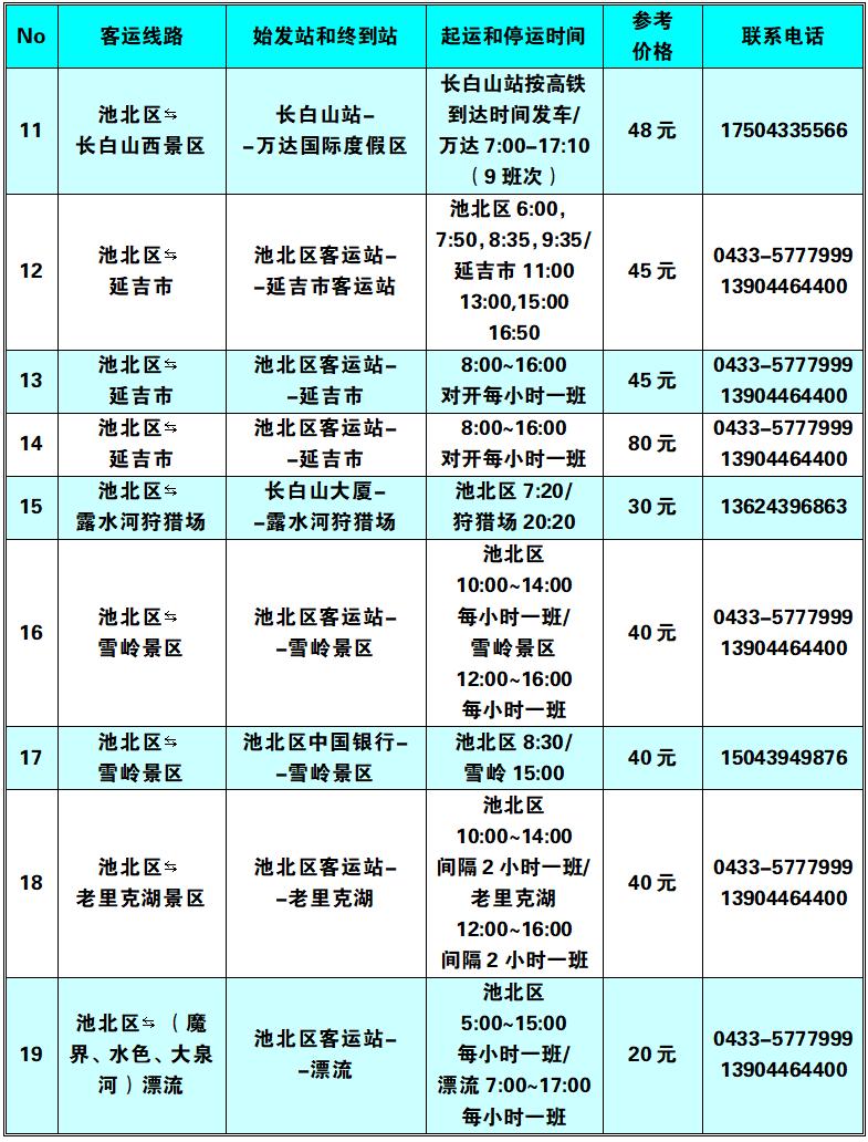 注:一是以上线路均已纳入“长白山一机游”小程序中“交通出行”里的“城区景区综合出行”栏目中,可实现网络预约包车和专车。二是出租车和网约汽车均可通过“吉林出租”小程序约车,实现“线上叫车、线上结账或线下打表计价”。三是原巡游出租车电话召车号码(池北区0433-5315678,5729999,5980000;池西区、池南区0439-6331555)仍正常使用。以上计划仅供参考,会因降雪、应急等不可抗力因素会发生缓发、停发等管制措施,具体以实际发车班次为准。(长白山管委会交通运输局)发布热线:0433-5710661