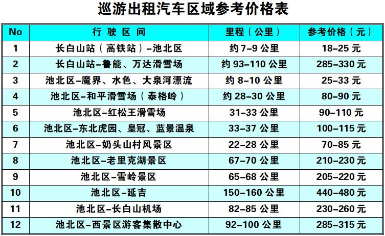 注:一是巡游出租汽车可通过“T3出行”和“高德地图”等实现网络预约。二是巡游出租汽车起步价6元(2公里);夜间(22:00-次日5:00)8元(2公里);2-5公里(2.1元/公里);5-10公里(2.7元/公里);10公里以上(5元/公里)。等候费:超过2.5分钟,1元/分钟。三是原巡游出租车电话召车号码(池北区0433-5315678,5729999,5980000;池西区、池南区0439-6331555)仍正常使用。(长白山管委会交通运输局)