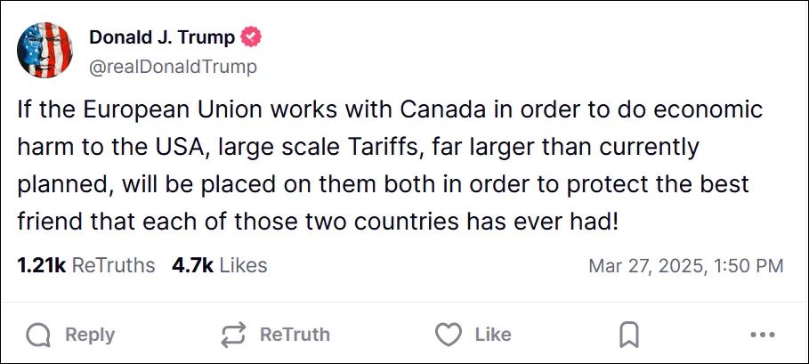 特朗普是在他签署关税行政令几个小时后发表上述言论的。当地时间27日凌晨,特朗普在其自创社交平台Truth Social上发帖说,如果欧盟与加拿大“联手对美国造成经济损害”,那么为了保护美国这个欧加“有史以来所拥有的最好的朋友”,欧加将被征收“远超目前计划的大规模关税”。