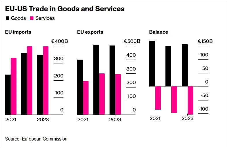 美国对欧盟在货物贸易方面存在逆差,但在服务贸易方面实现了顺差 彭博社制图
