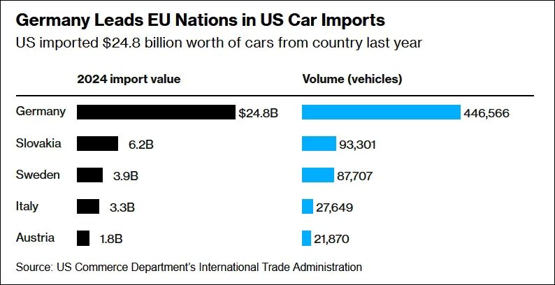2024年,德国、斯洛伐克、瑞典、意大利、奥地利占据欧盟国家对美汽车出口前五彭博社制图