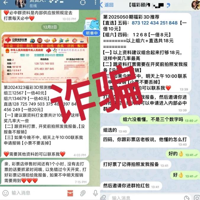 向受害者提供虚假的中奖号码,若未中奖则退还其购彩费用。同时,以完成任务可获得返佣或进入“精准消息群”等为诱饵,进一步巩固受害者的信任。