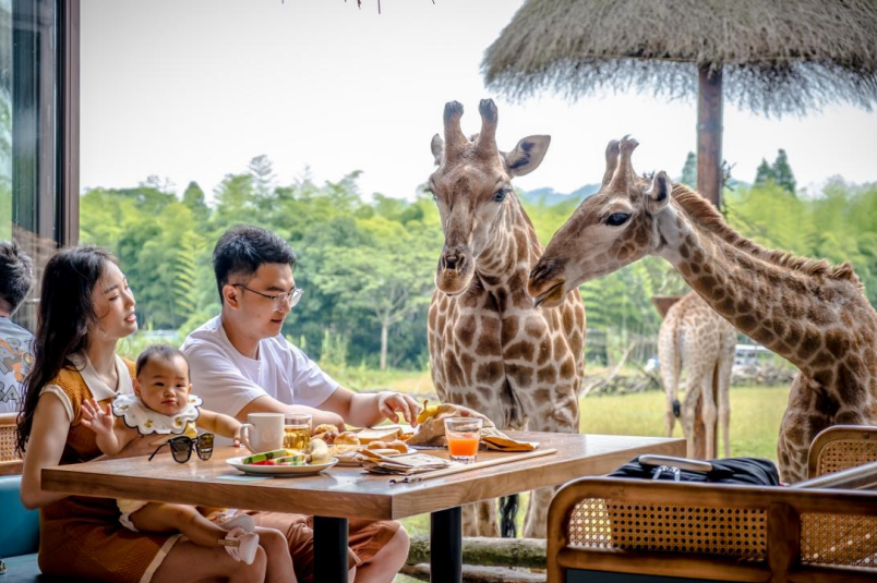 作为国内首家互动式长颈鹿庄园,“长颈鹿早餐”体验一直是朋友圈里的热门“社交货币”。清晨,阳光透过竹林斜射进全景餐厅,长颈鹿将修长的脖颈探入窗台,投喂胡萝卜时与长颈鹿温柔对视,感受睫毛轻扫的细腻。温热的鼻息混着青草香喷在你手腕,绒毛蹭过皮肤触发 ASMR 级酥麻,这一刻,轻松体验肯尼亚同款乐趣。