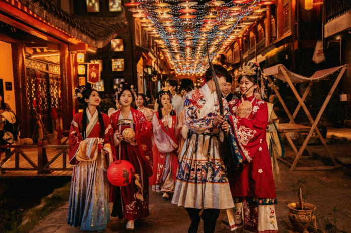 此外,还有盛唐市集、古风演绎、汉服走秀等精彩活动不断……篝火晚会是古城的“高光时刻”,游客可与当地人共舞民族打跳,感受热情奔放的边疆风情。