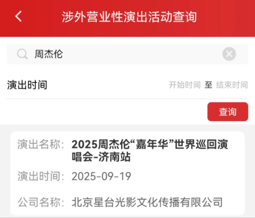 根据文旅部官方app“文旅市场通”显示,周杰伦2025嘉年华演唱会济南站时间:9.19-9.21 (连开三场)!