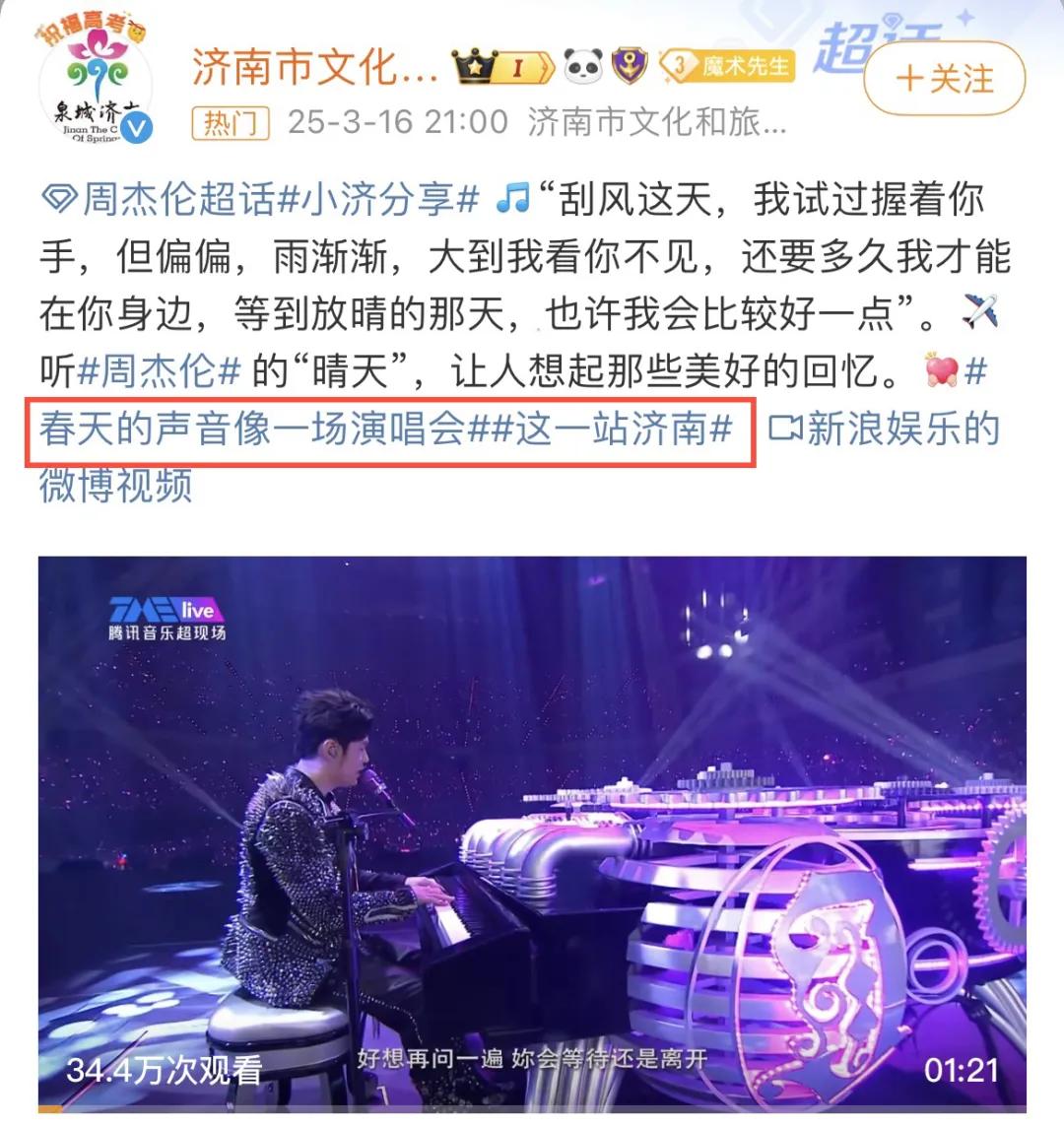 此前,济南市文化和旅游局3月16日发微博也提到过周杰伦演唱会,并挂话题#这一站济南。山东省文化和旅游厅就此正式确认了演唱会的消息!没有辜负歌迷们的期待!3-6月山东有这些演唱会举办