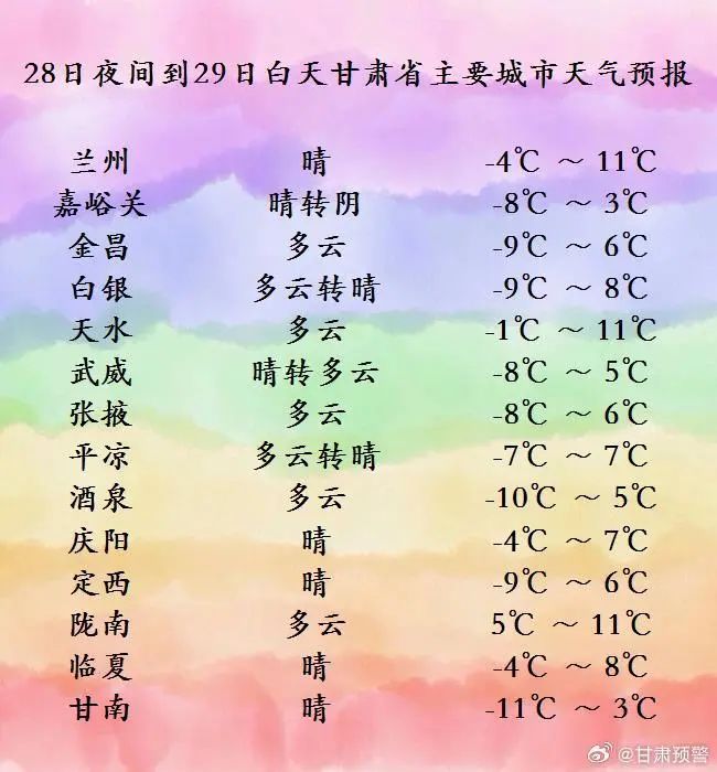 明天夜间到后天白天(03月29日20时-03月30日20时),全省各地晴或多云,祁连山区阴有小雪。