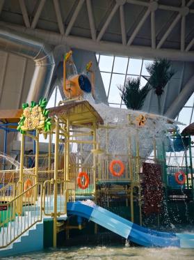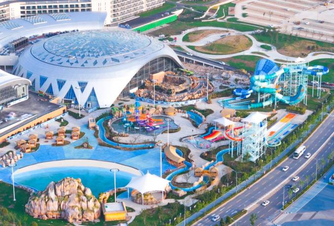 日照开元森泊度假乐园水乐园占地5万㎡,室内水乐园建筑面积2.08万㎡, 分上、中、下三层,可同时容纳1800人,透明星空穹顶外观状若海上明珠。