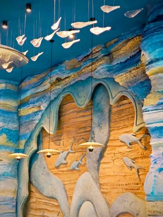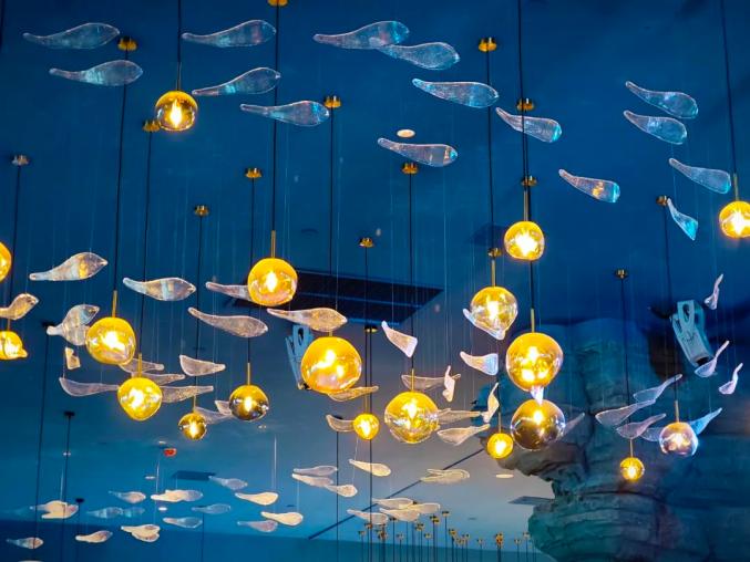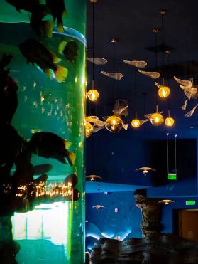 以海底寻宝为主题的特色自助餐厅,餐厅与海洋水族馆有机结合,进门映入眼帘的便是巨大的鱼缸和五彩的鱼群,仿佛置身海底世界。