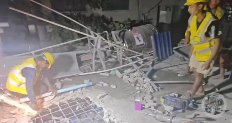 救援团队成员在垮塌建筑中切割钢筋。/视频截图