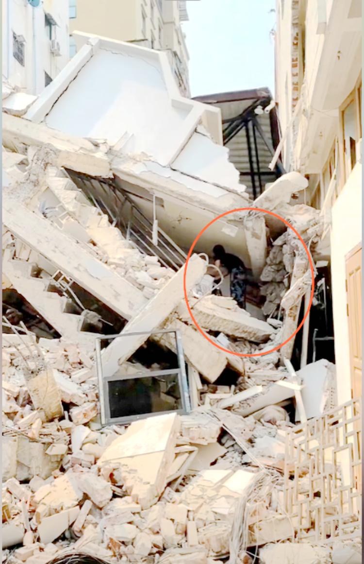 一个妈妈从楼栋缝隙安慰被埋在废墟的女儿。/受访者供图