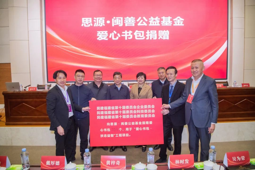 会议现场,企业委、科技委、教育委分别向闽善思源公益基金捐赠200个、53个、102个爱心书包,助力闽善公益基金“爱心书包·扶志益智”工程项目,支助乡村孩子课外阅读。其中福建中浩置业董事长吕少阳捐赠了24个,福建省源之宇宙科技集团有限公司总裁吴克华捐赠了28个,南平市昊伟新能源科技有限公司总经理王新火捐赠了20个,泉州信息工程学院董事长郭小平捐赠了100个。