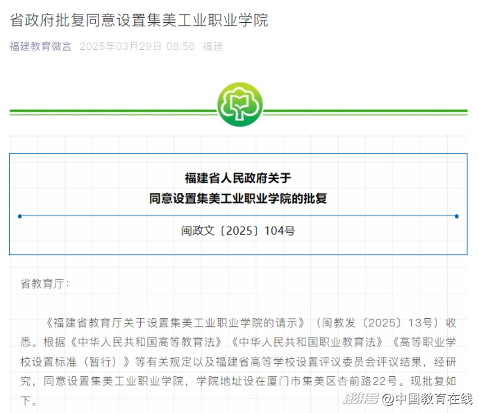 《福建省教育厅关于设置集美工业职业学院的请示》(闽教发〔2025〕13号)收悉。根据《中华人民共和国高等教育法》《中华人民共和国职业教育法》《高等职业学校设置标准(暂行)》等有关规定以及福建省高等学校设置评议委员会评议结果,经研究,同意设置集美工业职业学院,学院地址设在厦门市集美区杏前路22号。现批复如下。