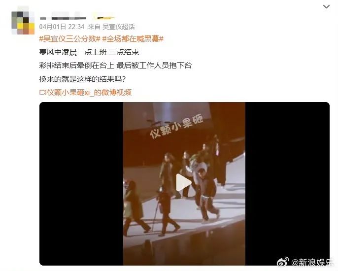 4月1日晚,粉丝透露吴宣仪彩排结束后晕倒在台上,最后被工作人员抱下台,引发热议。