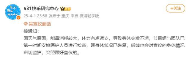 关于吴宣仪晕倒事件,吴宣仪对接方回应称:因天气原因,能量消耗较大,体力有点透支,导致身体突发不适,节目组与团队已第一时间安排医护人员进行检查,现身体状况已恢复,后续也会对宣仪的身体情况密切监护,会照顾好宣仪的。