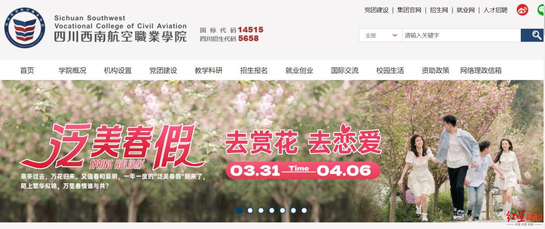▲四川西南航空职业学院网站首页上的春假通知记者看到,根据通知内容,该校的四川校区在3月30日至4月5日放春假,山东、安徽校区将在4月4日至4月10日放春假,以上假期安排均包括周末、清明的放假时间。